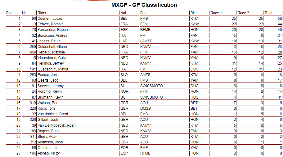 En la categoría reina, Lucas Coenen se impuso con fuerza. El belga lideró ambas series de principio a fin. Romain Febvre lo siguió de cerca tanto en la primera como en la segunda manga, pero nunca pudo superar a Coenen. Rubén Fernández, del Team HRC, también repitió su tercer puesto en ambas carreras. Coenen deja Águeda con 50 puntos y consolida el tercer puesto del campeonato. Febvre aprovechó la ausencia de Tim Gajser en Águeda para ampliar distancias en el campeonato. El francés lidera con 330 puntos, 25 más que Gajser. Coenen tiene 287 puntos.