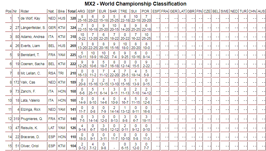 Con estos resultados en Águeda, la lucha entre De Wolf y Längenfelder sigue muy feroz. De Wolf lidera con 328 puntos, sólo cuatro más que su rival alemán. Adamo tuvo un fin de semana muy productivo, acortando distancias con la cima del campeonato al sumar 50 puntos. Ahora es tercero con 318 puntos.