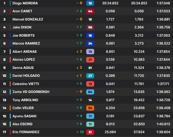 Ivan Ortola no pudo mantener el ritmo y el español se quedó atrás. En la vuelta 8, la moto número 4 estaba en séptima posición, detrás de González. El líder del campeonato siguió aumentando el ritmo, alcanzando a Jake Dixon y acortando distancias. Sin embargo, el progreso fue lento, con Aron Canet marcando un ritmo excelente al frente y marcando tiempos de vuelta prácticamente iguales a los de González, quien había ascendido a la cuarta posición a mitad de carrera. Manuel González se mantuvo en tercer lugar, pero el madrileño de 22 años solo pudo recortar distancias gradualmente. Con una diferencia de 3,7 segundos y cinco vueltas para el final, la batalla por la victoria se definió entre Canet y Moreira. Y así fue: aunque González redujo la diferencia a dos segundos, Canet y Moreira intercambiaron el liderato en la penúltima vuelta. Canet había abierto pista y Moreira lo había superado. En la última vuelta, el español lanzó un contraataque, pero la victoria fue para Diogo Moreira por primera vez.
