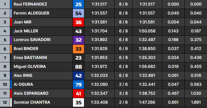 Jack Miller y Lorenzo Savadori completaron el Top 5, con Brad Binder, Enea Bastianini, Miguel Oliveira, Alex Rins y Ai Ogura completando los diez primeros. Aleix Esparagaró (11.º) y Somkiat Chantra (12.º) completaron la clasificación.