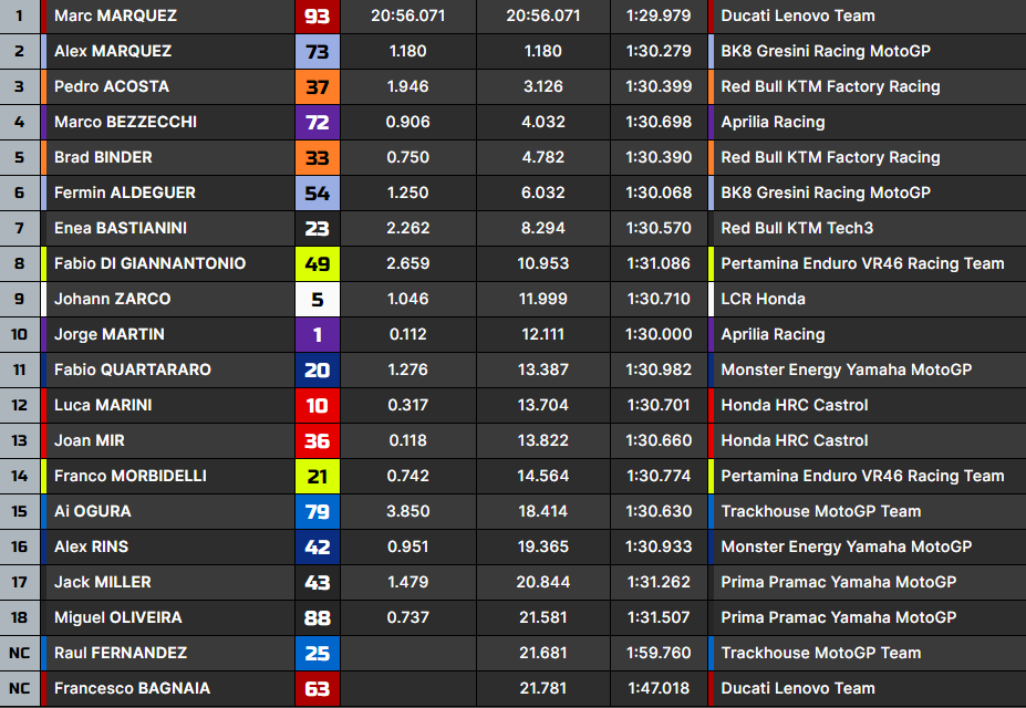 Antes de la última vuelta, Marc aventajaba a Alex por tres cuartos de segundo y 2,8 segundos por delante de Acosta, tercero, una clasificación que se mantuvo sin cambios hasta la bandera a cuadros. Marc celebró su duodécima victoria en su decimotercer sprint del año, ampliando su ventaja en el Campeonato Mundial sobre Alex a 123 puntos. Acosta, quien recibió una penalización por tanda larga en el Gran Premio del domingo tras su salida en el paddock durante la clasificación, recibió la medalla de bronce por el tercer puesto, lo que dio a KTM un motivo de celebración en su carrera de casa.