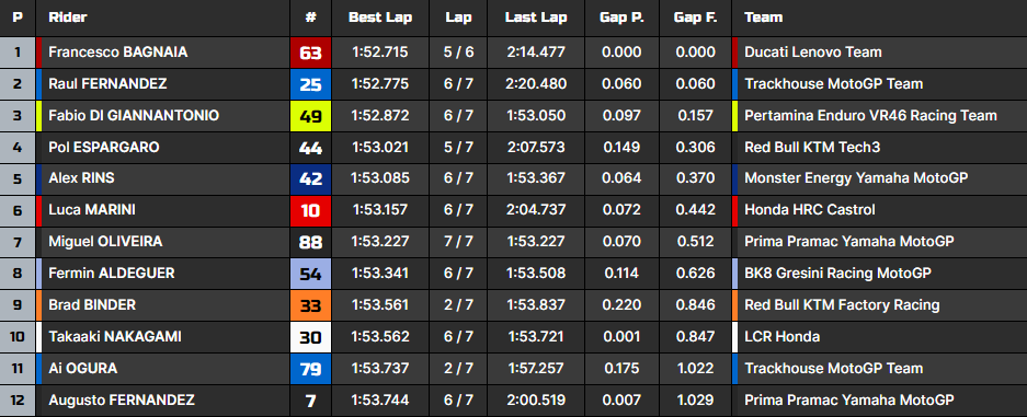El piloto de Trackhouse, Raúl Fernández, fue una décima más rápido que el de Ducati, asegurándose el tercer puesto entre los pilotos de Aprilia en la Q2. Tras Fernández, Di Giannantonio, Pol Espargaró y Alex Rins se quedaron fuera del segundo puesto, al igual que Miguel Oliveira, que terminó séptimo.