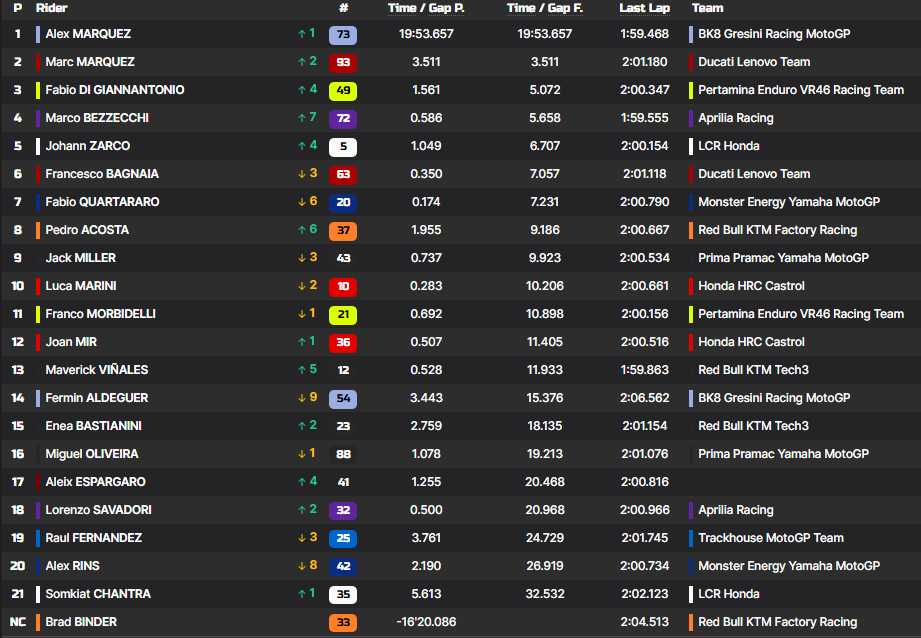 Los hermanos Márquez ya tenían entre 3 y 3,5 segundos de ventaja sobre Di Giannantonio. Y la ventaja de Alex sobre Marc ya había aumentado a dos segundos a falta de una vuelta. Un punto de inflexión en la serie de ganadores del sprint estaba ahora claramente en el horizonte.