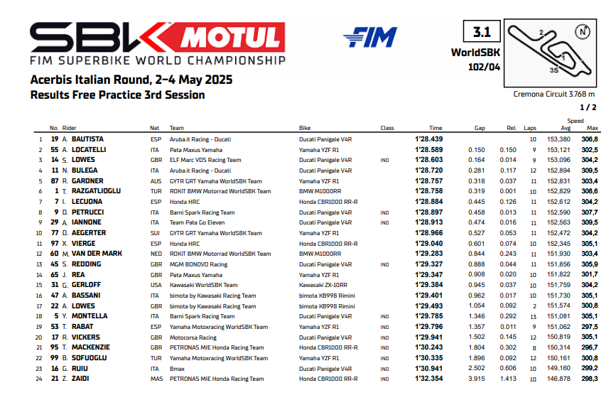 Tres minutos antes del final, el piloto oficial de Yamaha, Andrea Locatelli, tomó la delantera con un tiempo de 1:28.589 min. El bicampeón del mundo Álvaro Bautista (Aruba.it Ducati), que sufrió tres accidentes el viernes, respondió con un tiempo de 1:28.439 min. Nadie se acercó al tiempo del español hasta que cayó la bandera a cuadros blancos y negros. Bautista fue 0,150 segundos más rápido que Locatelli, seguido por Sam Lowes, Bulega, Gardner (Yamaha), Razgatlioglu (BMW), Lecuona (Honda) y el triple ganador del año pasado, Petrucci.