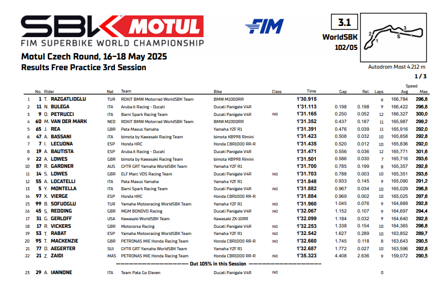 A diferencia de la acción del viernes, la pista estaba completamente seca esta mañana mientras los pilotos se aventuraban a salir para su última oportunidad de prepararse para la Tissot Superpole. Sin embargo, al igual que el viernes, Razgatlioglu encabezó la tabla de tiempos. Su primera vuelta representativa fue de 1’30.915s, abriendo una ventaja de medio segundo en ese punto, aunque la diferencia se fue reduciendo a medida que avanzaba la sesión. Bulega, declarado apto tras su caída en la FP1, consiguió el segundo puesto en 1’31.113s; dos décimas de ‘El Turco’. Danilo Petrucci (Barni Spark Racing Team) fue tercero, a aproximadamente media décima de Bulega, que fue segundo.