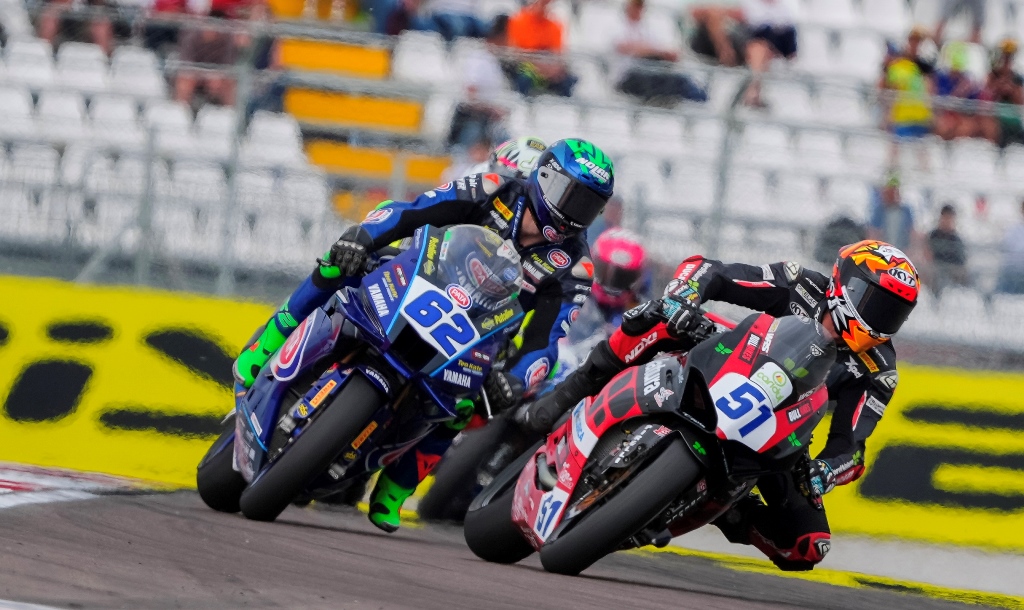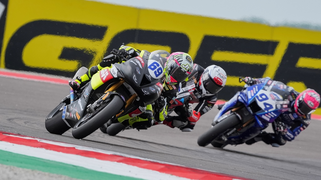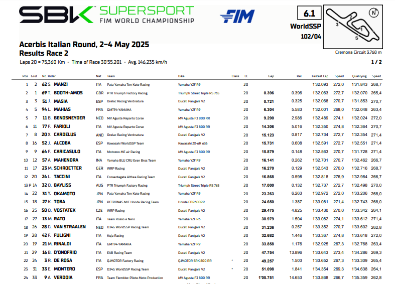 Tras el éxito del sábado, Stefano Manzi consiguió un doblete en la Carrera 2. El piloto de Romaña estudió primero durante un largo rato al líder de la carrera, Jaume Masia, antes de atacarlo en la curva 13, a apenas dos tercios de la carrera. El español respondió al primer ataque retomando el liderato de la carrera en la curva 1, pero no pudo hacer nada ante el segundo intento de Manzi en la vuelta siguiente. Una vez en cabeza, Stefano consiguió resistir la presión de Masia que, en la última vuelta, cometió un error a la salida de la curva 4 y fue atacado y superado por Tom Booth-Amos. Sin embargo, Jaume Masia consiguió su primer podio en WorldSSP, demostrando que era solo cuestión de tiempo antes de que el Campeón del Mundo de Moto3 2023 alcanzara lo más alto de la categoría. Incluso en la Carrera 2, Lucas Mahias, después de una buena salida con un nuevo récord de pista de 1’32”001, sin embargo, se separó del cuarteto líder, en el que también estaba Valentin Debise, hasta unas vueltas del final, tras resbalar en la curva 11.