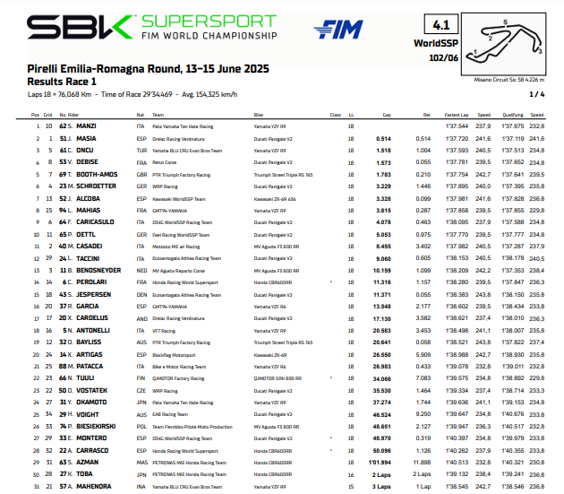 A tres vueltas del final, Manzi demostró por qué, tras aguantar a las estrellas de Ducati Nicolò Bulega y Adrian Huertas con una Yamaha R6 inferior durante los dos últimos años, ahora es el piloto más destacado de esta categoría. Subió aún más el listón, lo suficiente como para protegerse de los ataques de Masia y Oncu, que fueron particularmente agresivos. El español se escapó del turco en la última vuelta, demasiado tarde para pensar en adelantar a la Yamaha, que incluso tenía una ligera ventaja sobre la Ducati en la recta. Oncu completó el podio temiendo que Valentin Debise lo adelantara en meta: solo 55 milésimas de segundo entre ambos.